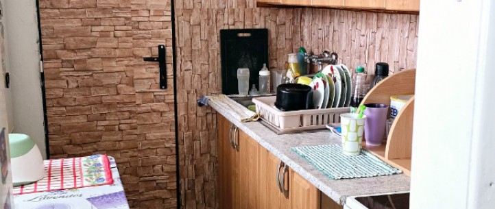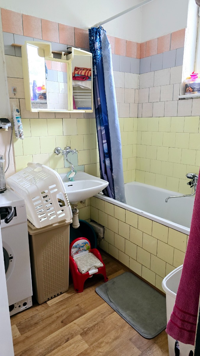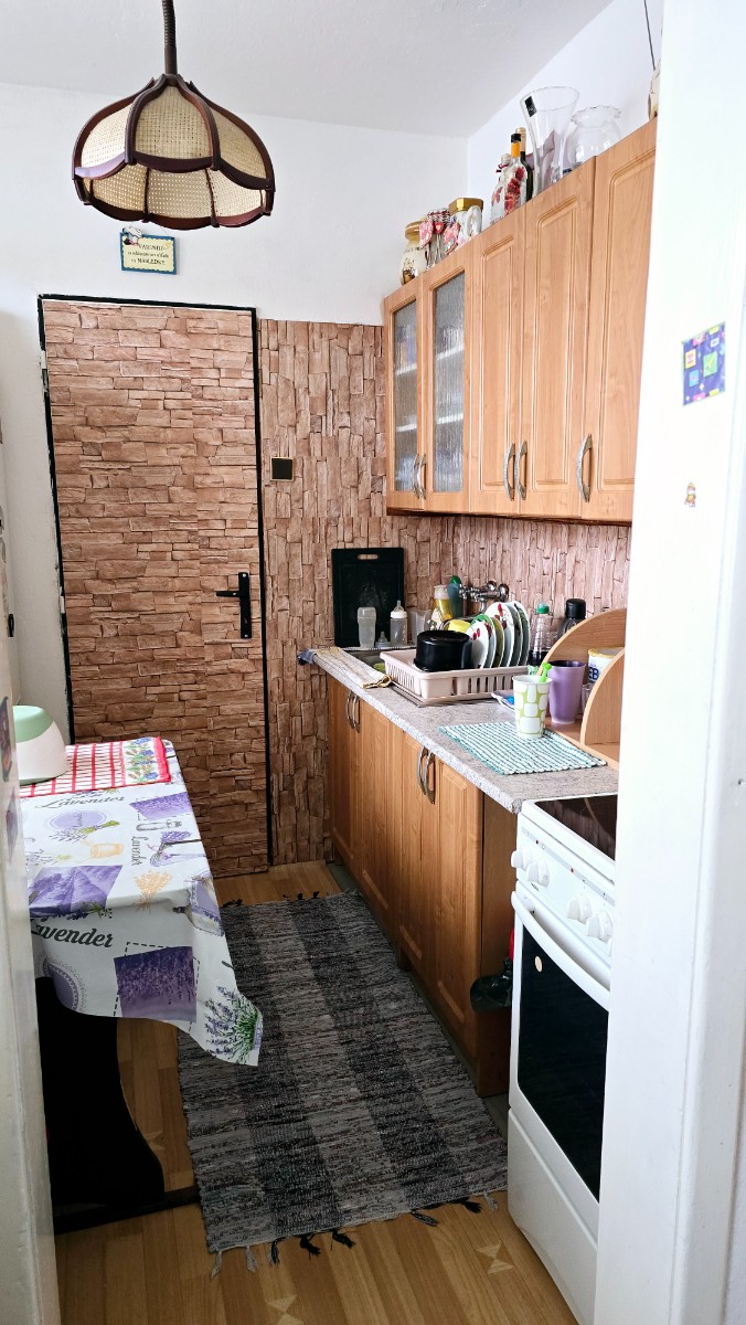 Kuchyňa je spojená s jedálňou a špajzou. Kúpeľňa je vybavená umývadlom, vaňou a WC a prípravou na zapojenie práčky. Kúrenie je zabezpečené peletkovým kotlom, ktorý sa nachádza na prízemí obytného domu. V celom byte sú pôvodné parkety a linoleum. Bytové jadro je tehlové.